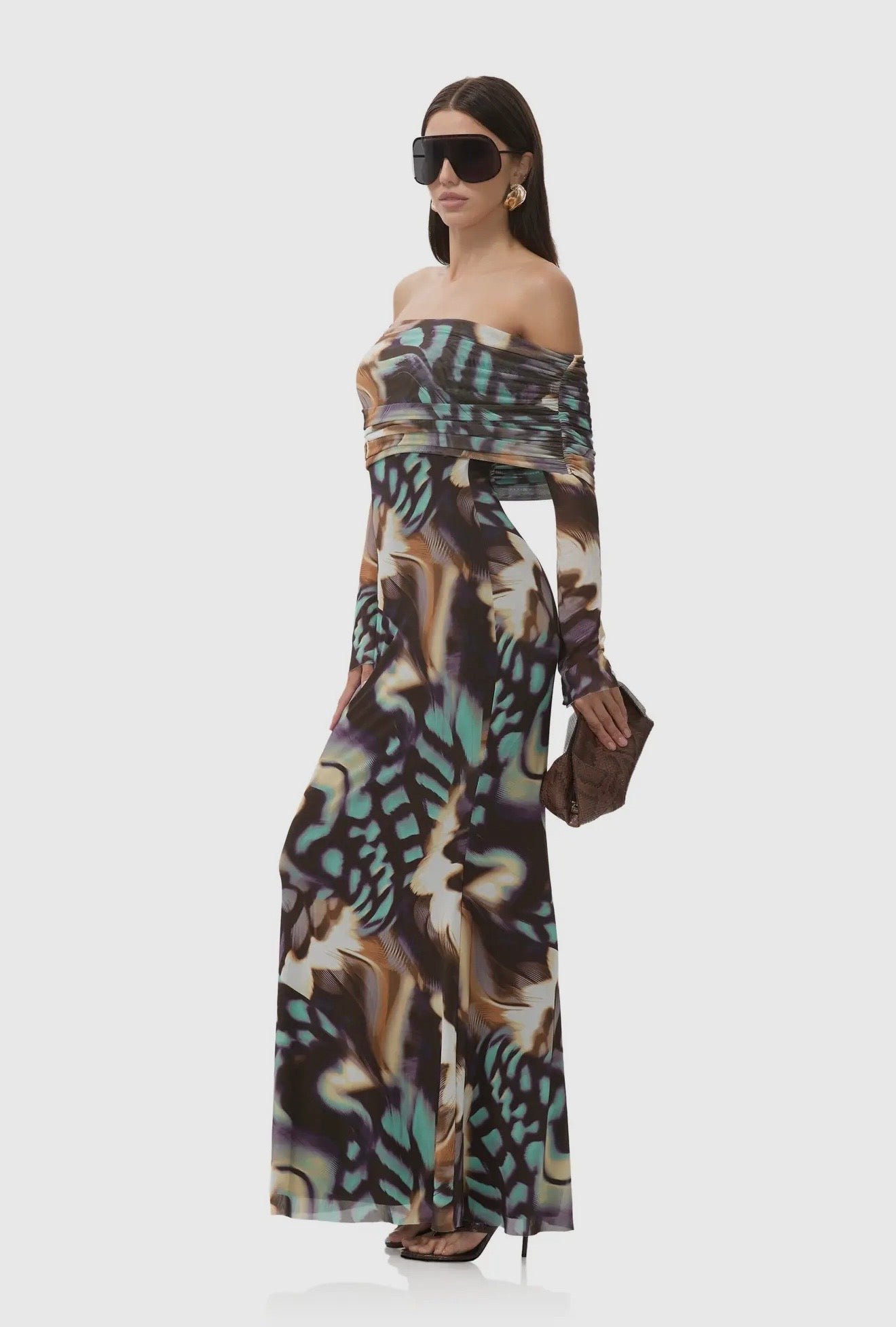 Our best-selling icon for a reason, the impressive Thelma. With long sleeves, gathered details and an off-the-shoulder design, Thelma offers a bold feminine beauty in the ultimate Feather Swirl power mesh print.