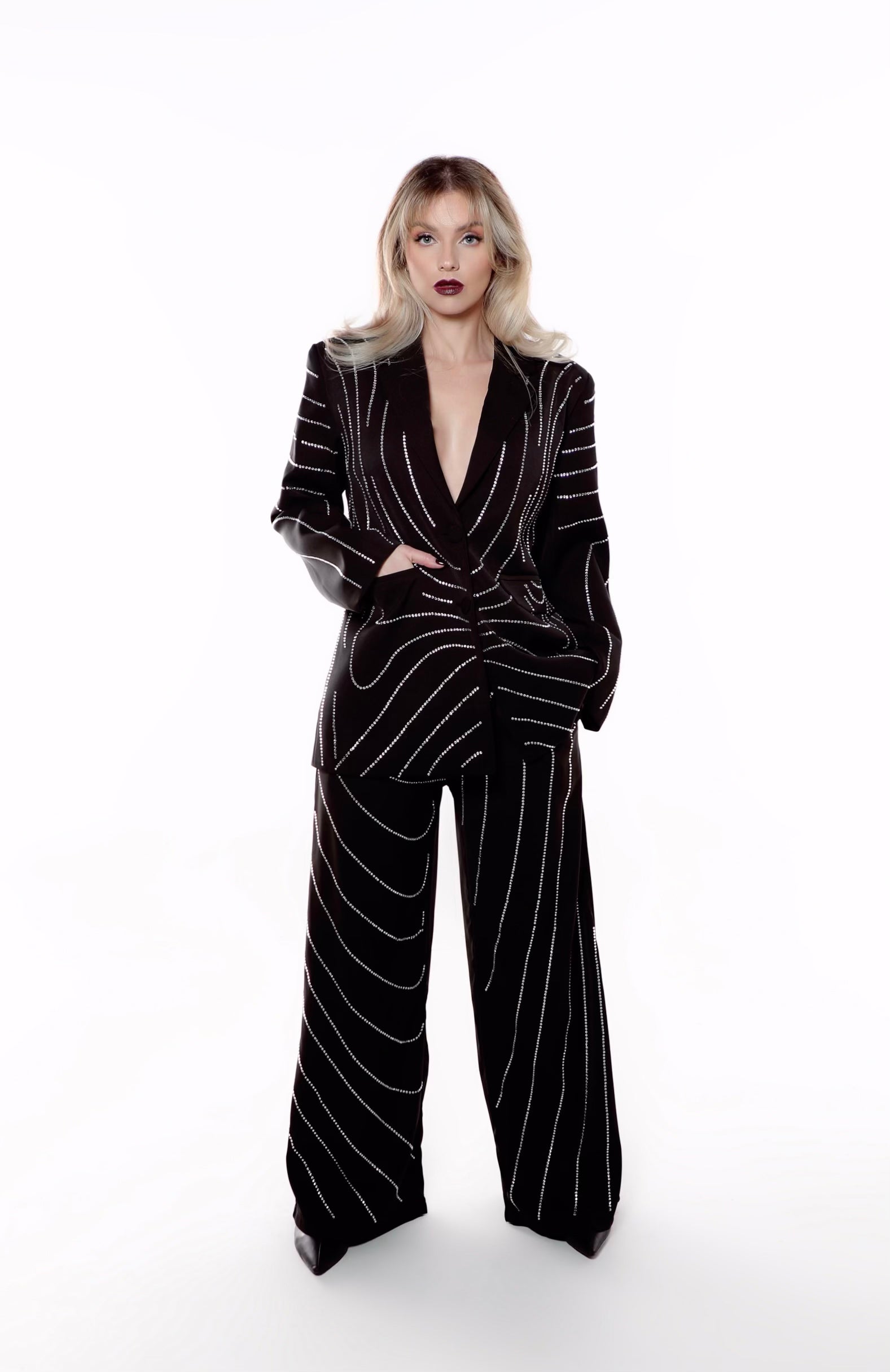 Two-piece suit with shiny details This sophisticated two-piece suit combines elegance and modernity, perfect to stand out at formal events or evening galas. The structured-fit blazer features a design of bright lines that bring a touch of glamour and avant-garde, while the wide-leg pants offer comfort and movement without losing style.