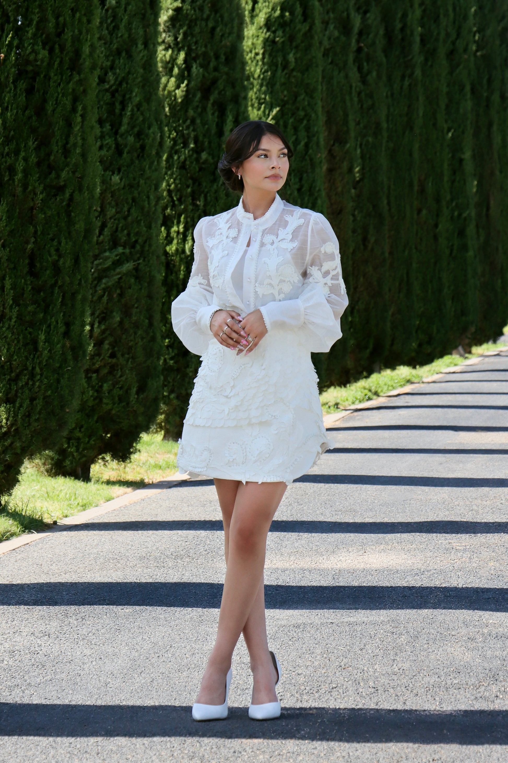 The skirt, also white, is short and decorated with textured details that resemble scales or ruffles, creating a three-dimensional and luxurious effect. The high waist of the skirt helps to define the figure and adds elegance to the ensemble.