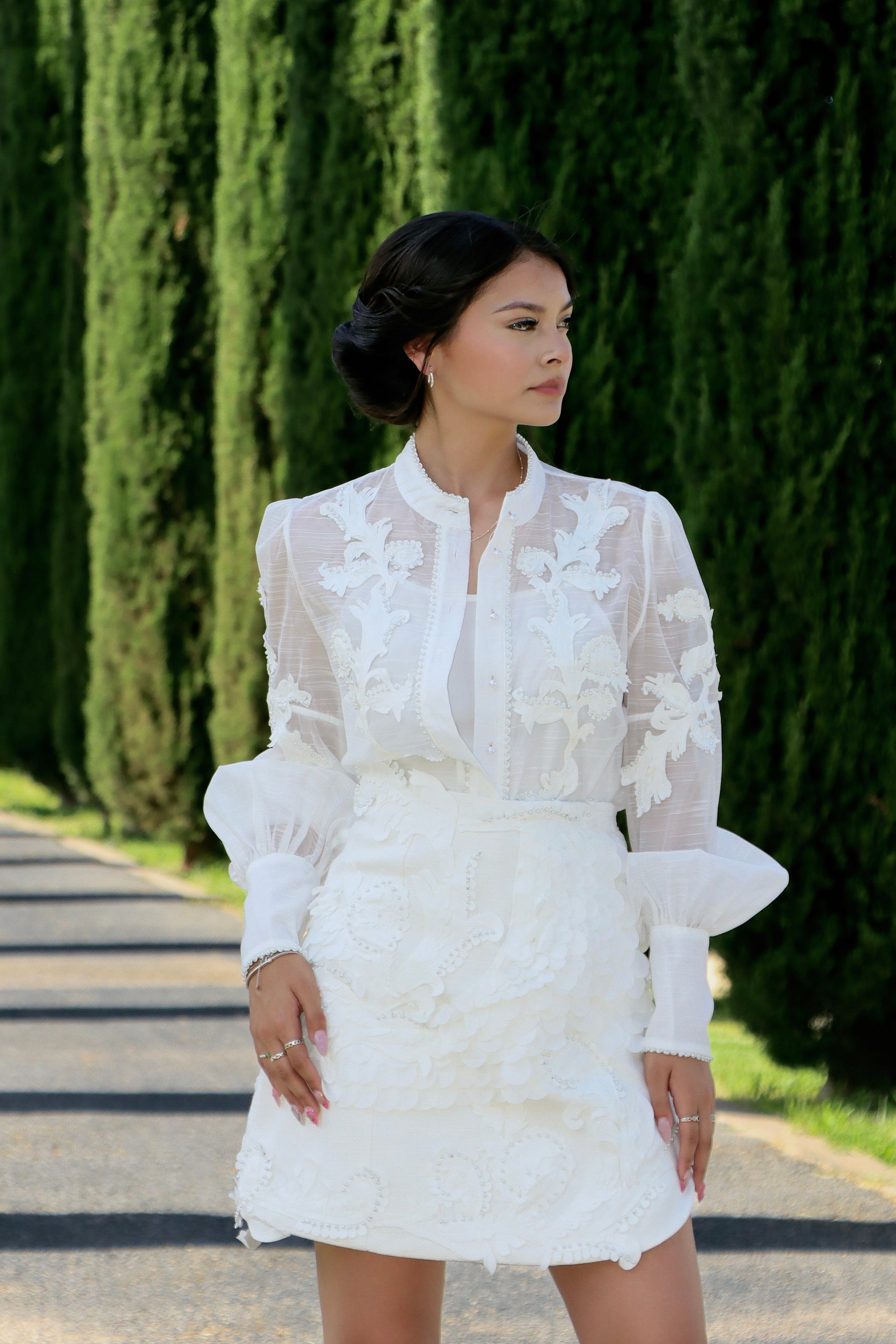An elegant ensemble consisting of a blouse and a skirt. The blouse is white with long, transparent sleeves, adorned with intricate floral embroidery on the front and arms.