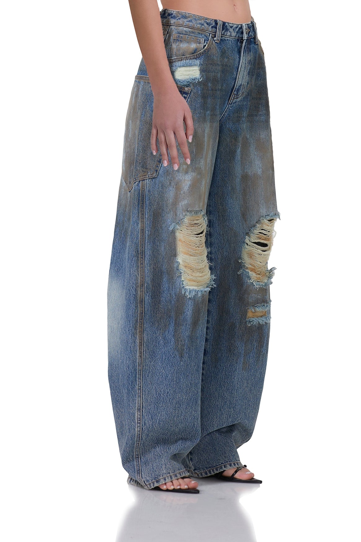 This pair of jeans is not for the faint of heart. Featuring an exaggerated wide-leg silhouette, bold distressed details, and a grungy worn-out wash, they’re made for those who dress to stand out. Pair them with heels or sneakers.