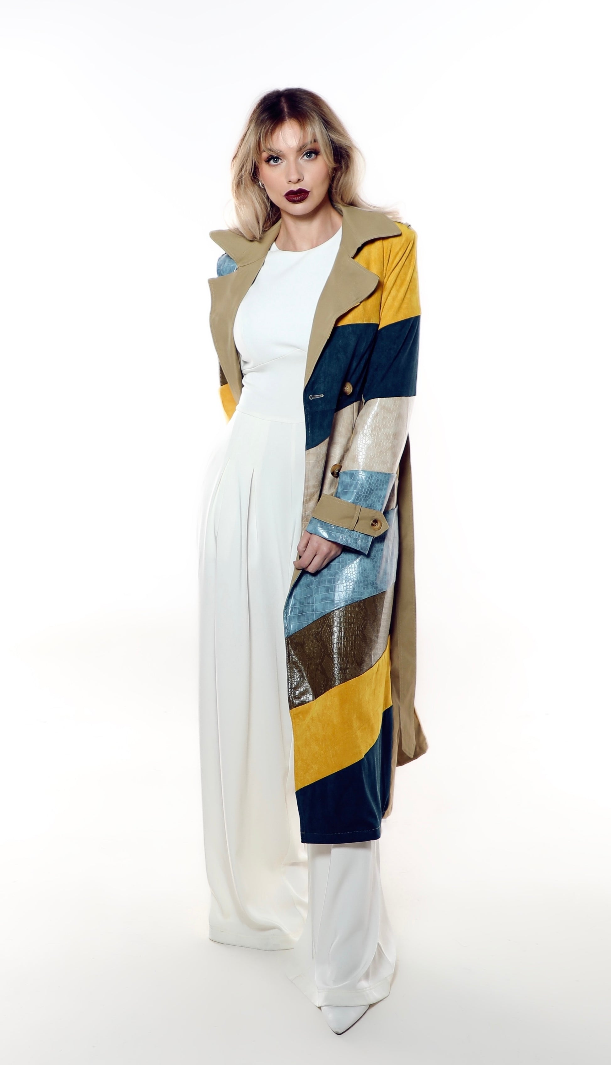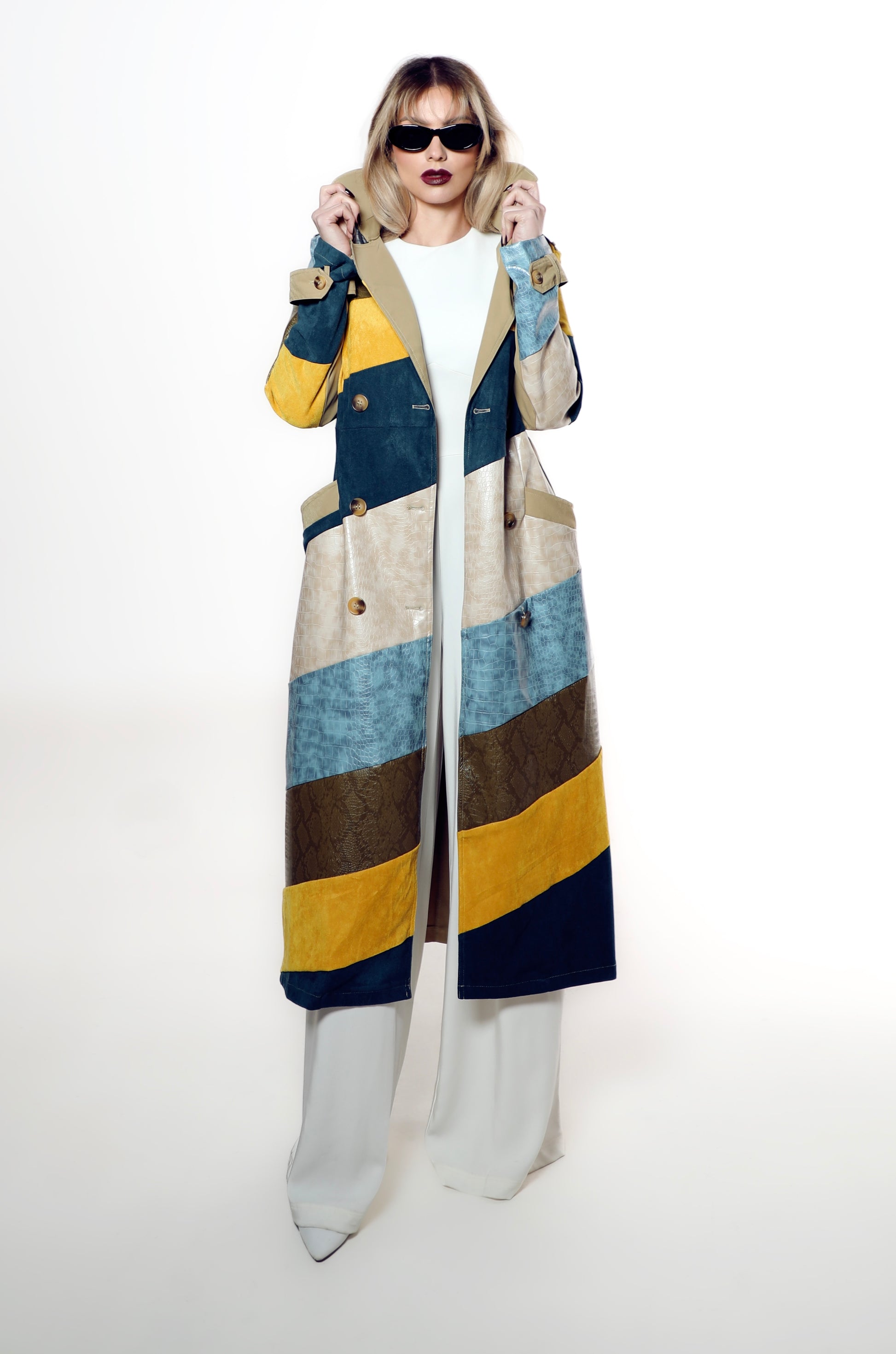 A unique design that combines vibrant color blocks with modern textures. This trench is perfect for those who want to stand out with style and elegance. Ideal for the season, pair it with neutral tones for a sophisticated look or dare to add contrasting accessories for a bold statement.