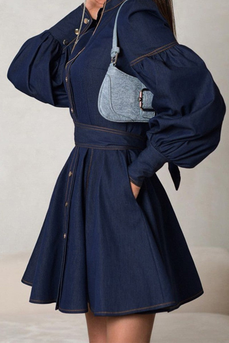 A modern twist on a timeless classic. This dark denim mini dress stands out with its structured puff sleeves, high mandarin collar, and button-down front. Designed to accentuate the waist with a matching belt, it brings the perfect balance of elegance and casual flair. The flared skirt adds movement and a playful touch, making it ideal for day-to-night looks.