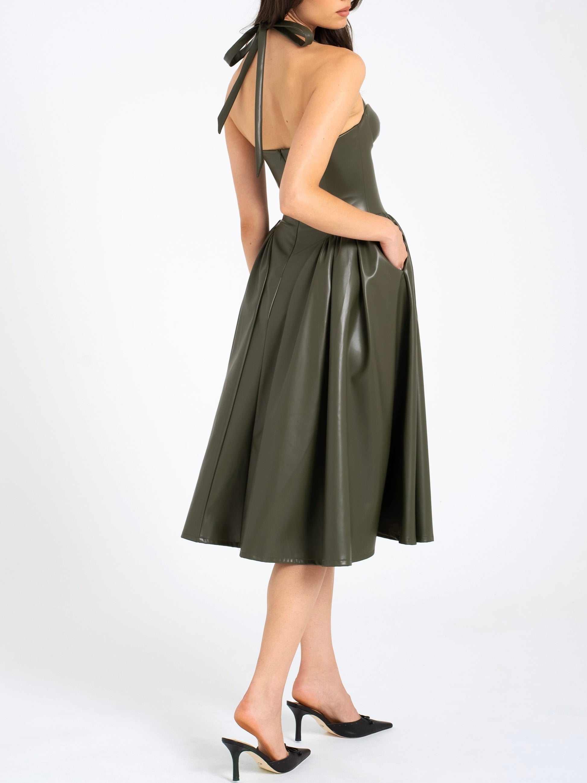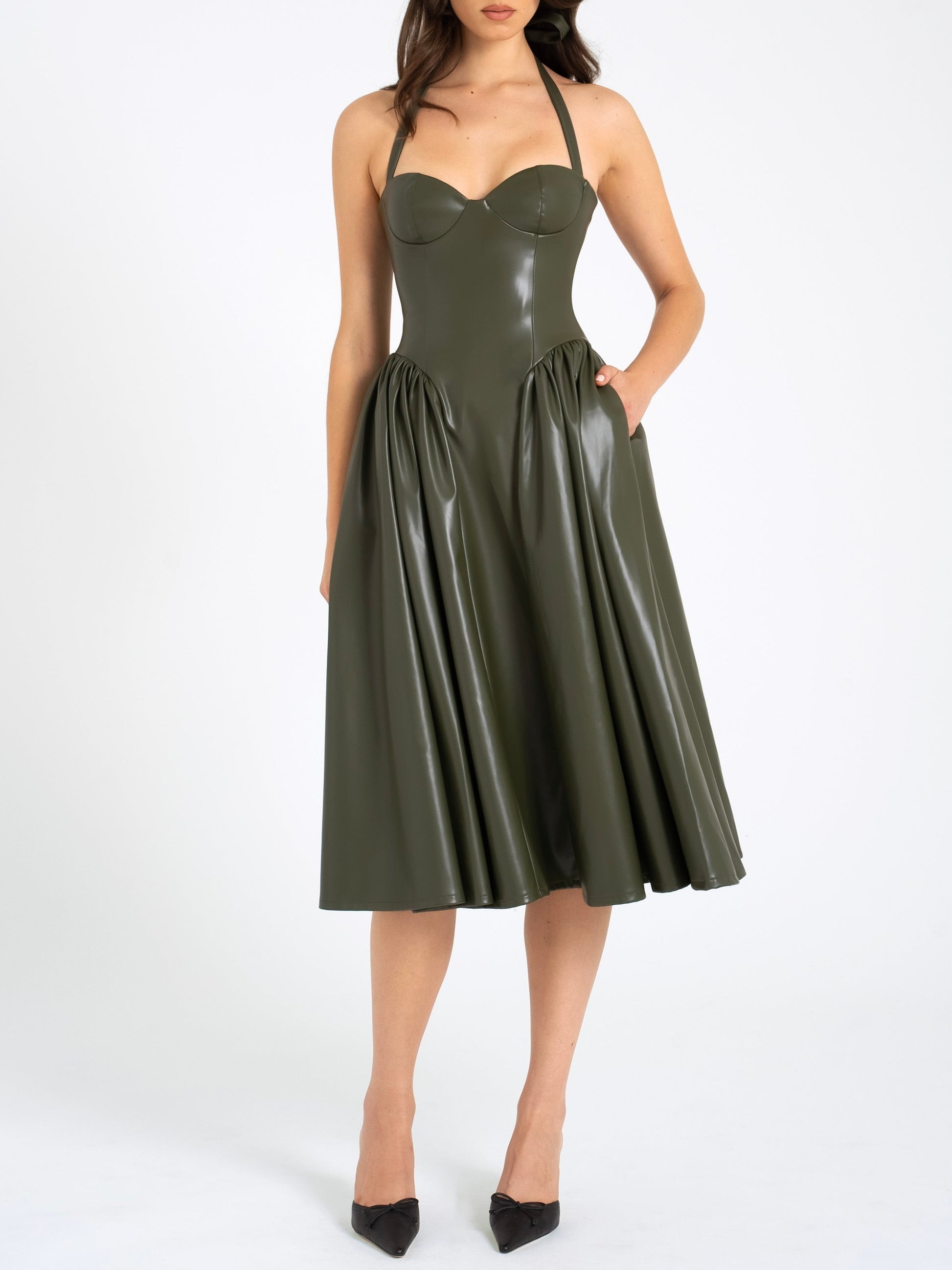Bold, structured, and unforgettable. This olive green vinyl corset dress redefines modern femininity with its sleek finish and sculpted silhouette. Featuring a fitted bodice with corset-style seams, supportive cups, and halter neckline, it accentuates the waist while the voluminous skirt adds dramatic movement.