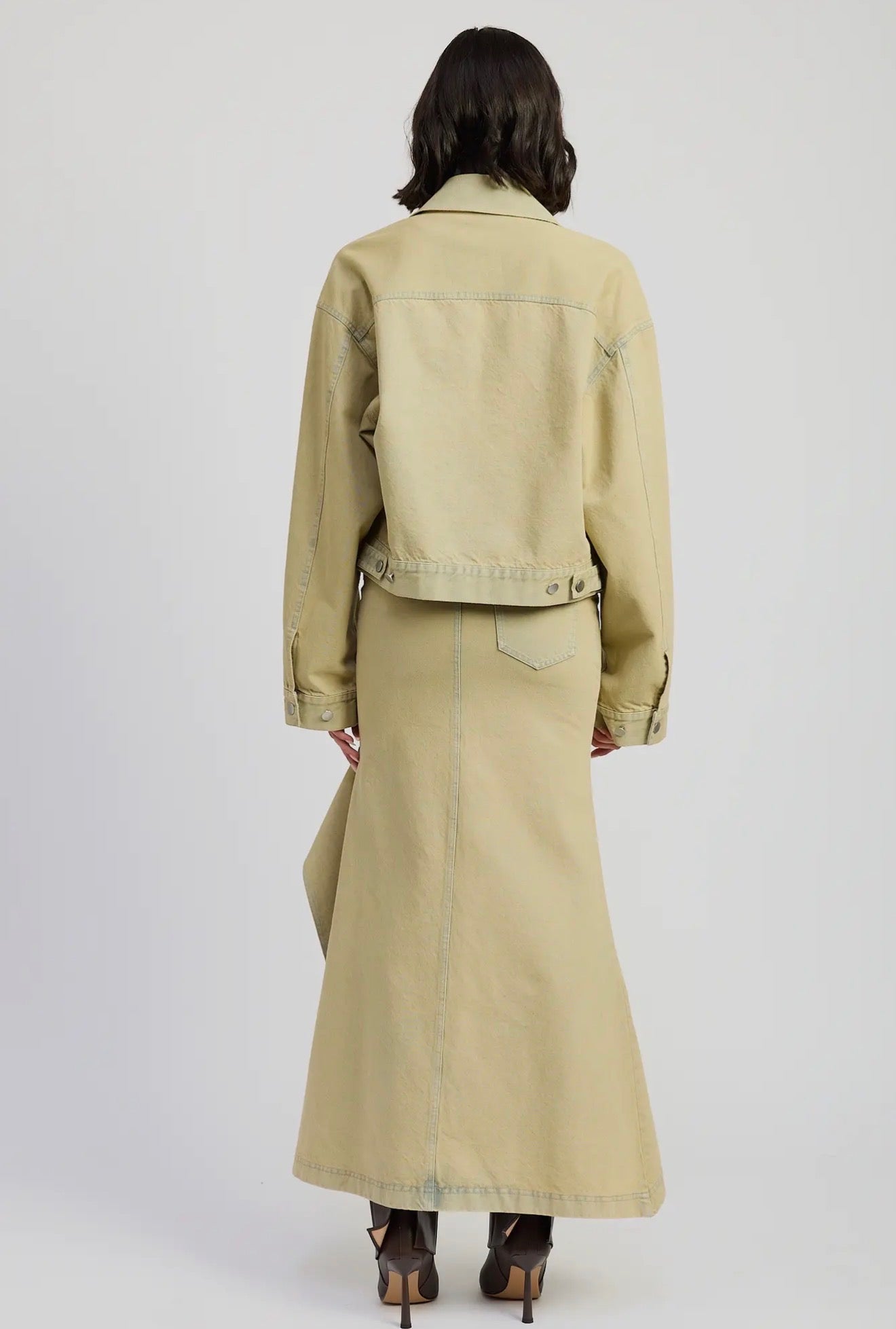 The texture of the soft denim in sand tone brings neutrality and elegance, allowing it to be combined with basic tops, high boots or sandals depending on the season. It is a look that stands out effortlessly, perfect for those who love unique pieces with character