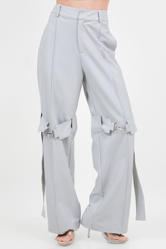 Designed to turn heads, these pants blend structure with a bold silhouette. Featuring adjustable side slits and standout buckle accents, they strike the perfect balance between edgy and sophisticated. Crafted in a light gray tone that pairs with everything, they’re ideal for editorial looks, nights out, or a powerful street-style moment.