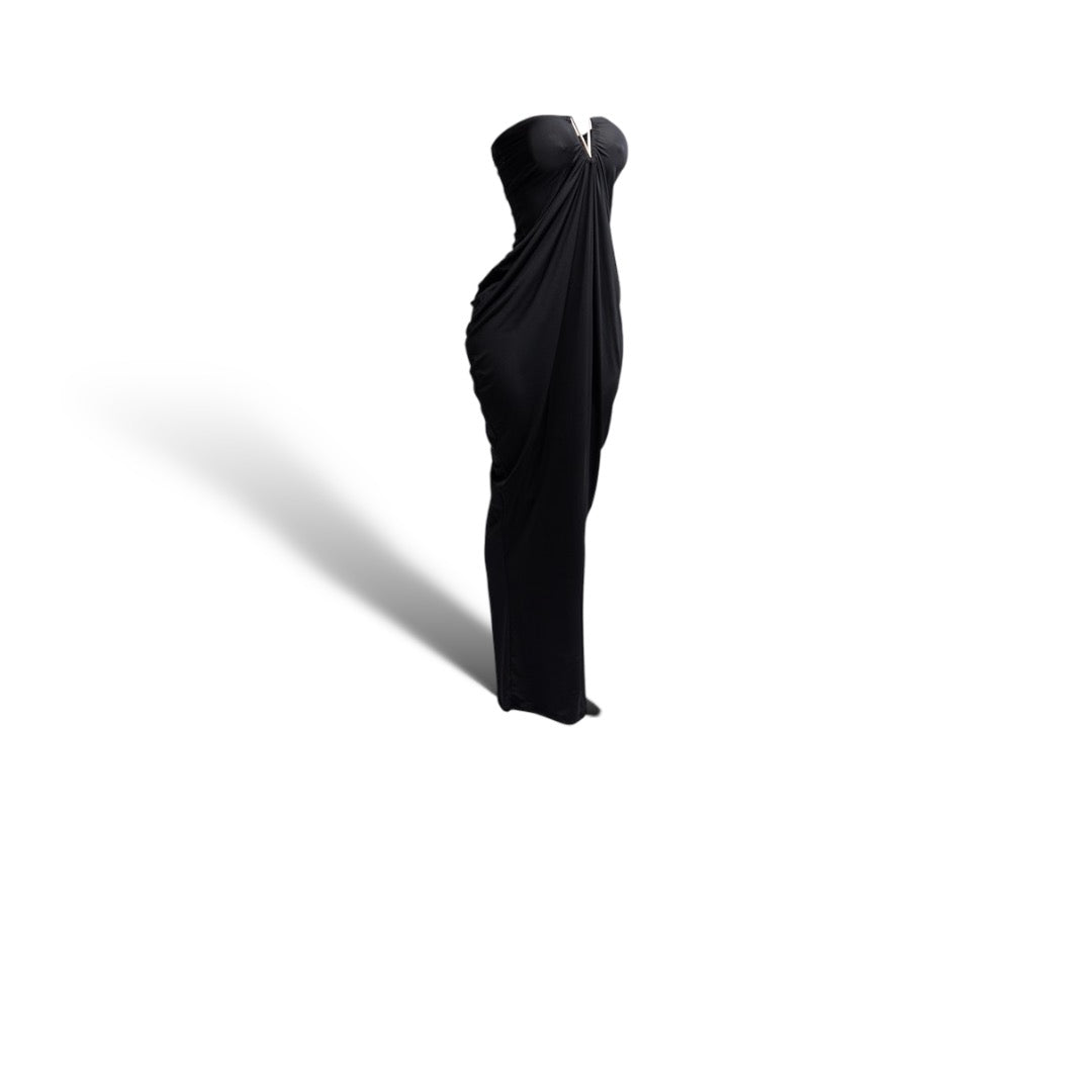 Strapless gown adorned with V-shaped trim, elegantly draped to embrace the form. Features exquisite ruching at the back and a daring slit at the front, crafted from sumptuous stretch fabric.